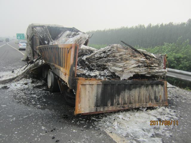 出险原因:轮胎突然自燃,导致车上货物80%烧毁;